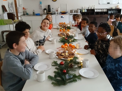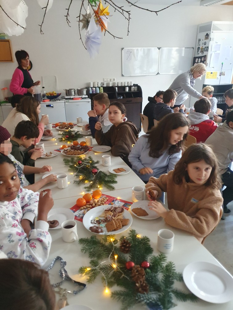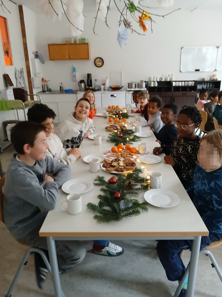 Mit dem Geld konnten in diesem Jahr sogar zwei Feiern gestaltet werden: Einmal eine Adventsfeier für die kleineren Kinder und einmal eine vorweihnachtliche Feier für die größeren Schüler. An der weihnachtlich dekorierten Tafel ließen sich die Kinder Plätzchen, Nüsse, Mandarinen und Kinderpunsch schmecken und teilten so schon weihnachtliche Freude.