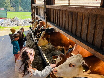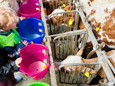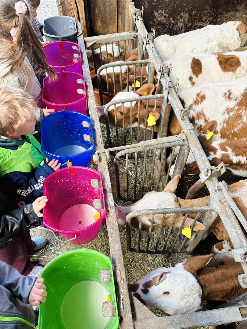 Ein besonderes Erlebnis war das Füttern der Kälbchen: Jedes Kind durfte ein Kälbchen selbstständig mit einem Eimer Milch versorgen und so Verantwortung übernehmen.