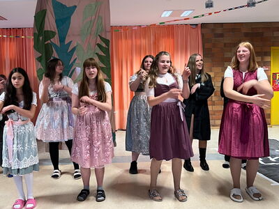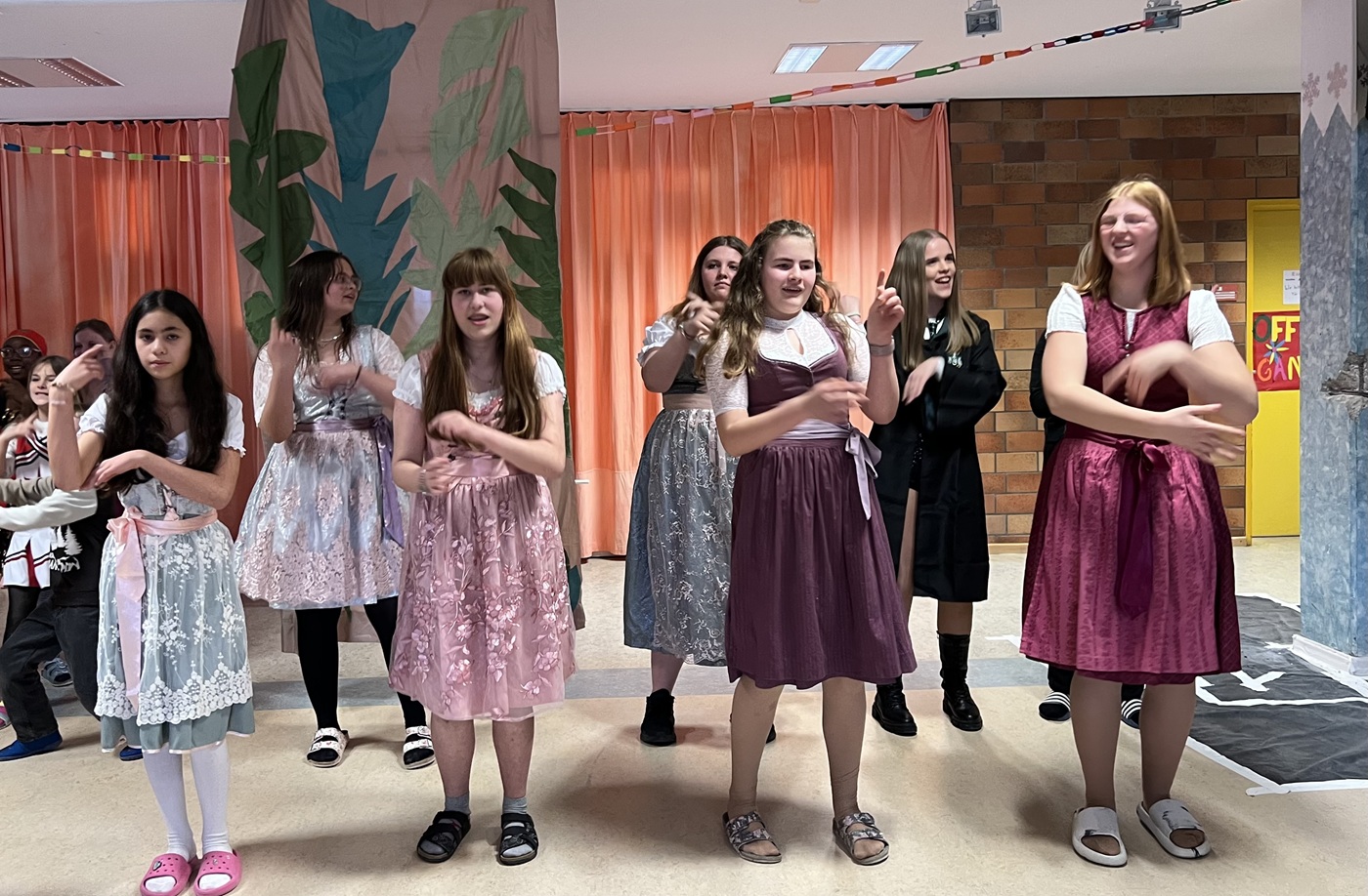Feen, Prinzessinnen, Piraten, Superhelden, Sportler, Zauberer und viele andere bunte Gestalten füllten die Aula und sorgten für heitere Stimmung. Frau Pauli führte humorvoll durch das abwechslungsreiche Programm. Zum Start gab es ein Knieballett der Klasse 5, bei dem alle herzlich lachen mussten. Bei verschiedenen Tänzen und Spielen konnten sich alle Mitglieder der Schulfamilie beteiligen. Wir tanzten zum „Zauberer Schrabbelschrut“, tanzten den „Lapadu“, die „Laurentia“, den Ententanz und auch den Zeitungstanz. Wir spielten die Spiele „Die heiße Faschingskrone“ und „Fang den Lehrer“ und die Mädchen der Klassen 5-9 zeigten uns in ihren bunten Dirndln wie Line Dance getanzt wird. Frau Wieczorek sorgte als DJ für mitreißende Musik, so dass die Tanzfläche gut gefüllt war. Zum Abschluss machten wir eine lange Polonaise durch das Schulhaus. Am Ende waren sich alle einig: Diese Faschingsfeier war ein voller Erfolg und wird noch lange in Erinnerung bleiben.