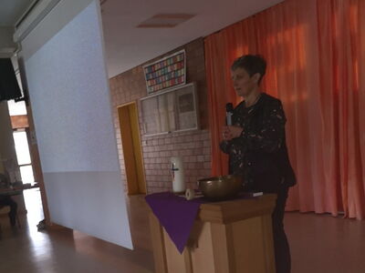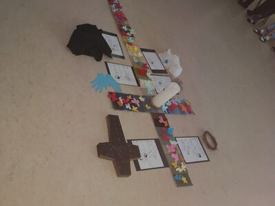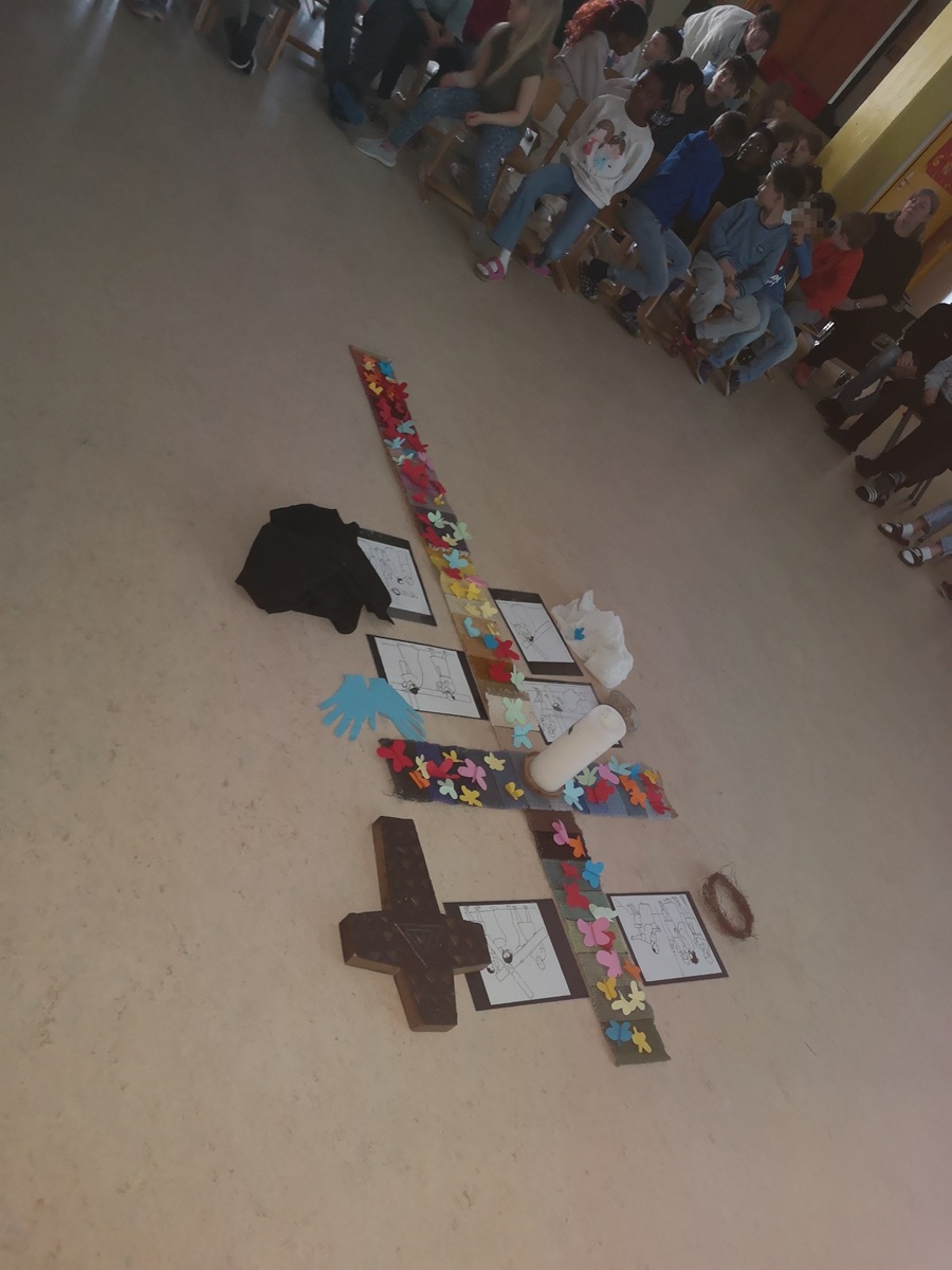 In der Mitte hatten wir ein großes Kreuz aus zwei bunt gewebten Streifen gelegt. Immer zwei Schüler unserer Klasse stellten den mitfeiernden Schülern eine Kreuzwegstation vor. Insgesamt betrachteten wir sechs ausgewählte Stationen. Die Bilder dazu zeigten wir auch auf der großen Leinwand her. Zu jeder Station trugen wir je eine kurze Betrachtung und ein Gebet vor. Symbolisch legten wir entlang des Kreuzwegs passende Zeichen ab. Als österliches Zeichen dafür, dass Jesus an Ostern von den Toten auferstanden ist, durfte jedes Kind bei der Kreuzverehrung einen Papierschmetterling ablegen. Frau Pauli und Pfarrer Jonathan Steensen, der uns am Schluss noch den Segen gab, begleiteten uns abwechselnd beim Singen passender Lieder. Nach der Feier verteilten wir als Erinnerung in den einzelnen Klassen Ausmalbilder mit einem Schmetterling. Darauf stand: „Jesus lebt!“ Dieses Bild durften die Kinder anschließend anmalen und als Erinnerung ins Religionsheft einkleben.