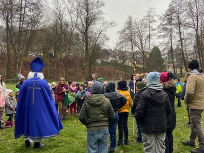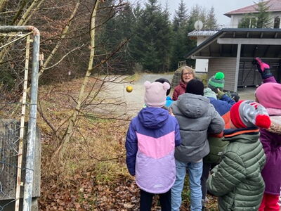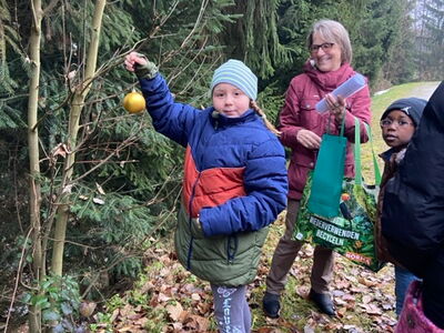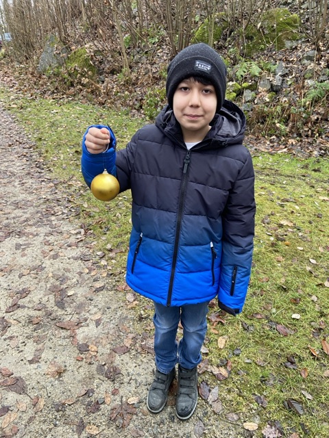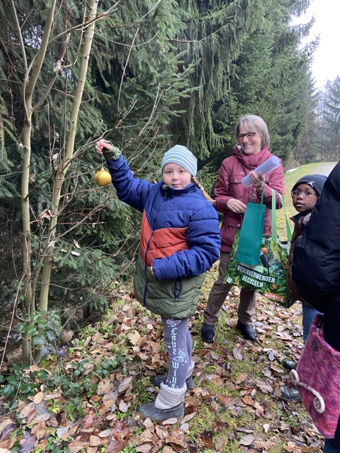 Zwei Wege entdeckten wir: Der eine Weg entlang des Staffelbachs war mit roten Christbaumkugeln und laminierten Nikoläusen gekennzeichnet, der andere Weg über den Busparkplatz war mit goldenen Christbaumkugeln und ebenfalls laminierten Nikoläusen geschmückt. Beide Wege führten zum Pavillon im Roccopark. Und die ersten, die den Nikolaus dort fanden, waren die Kindergartenkinder und die erste Klasse.
