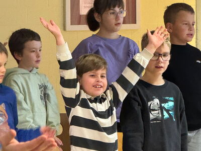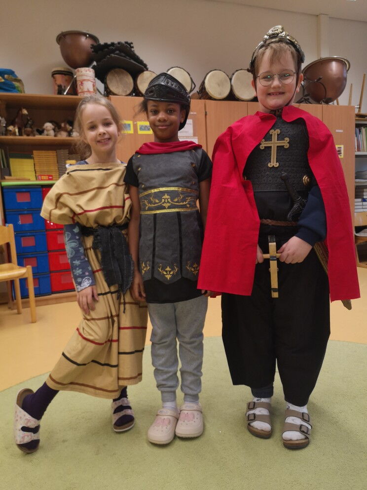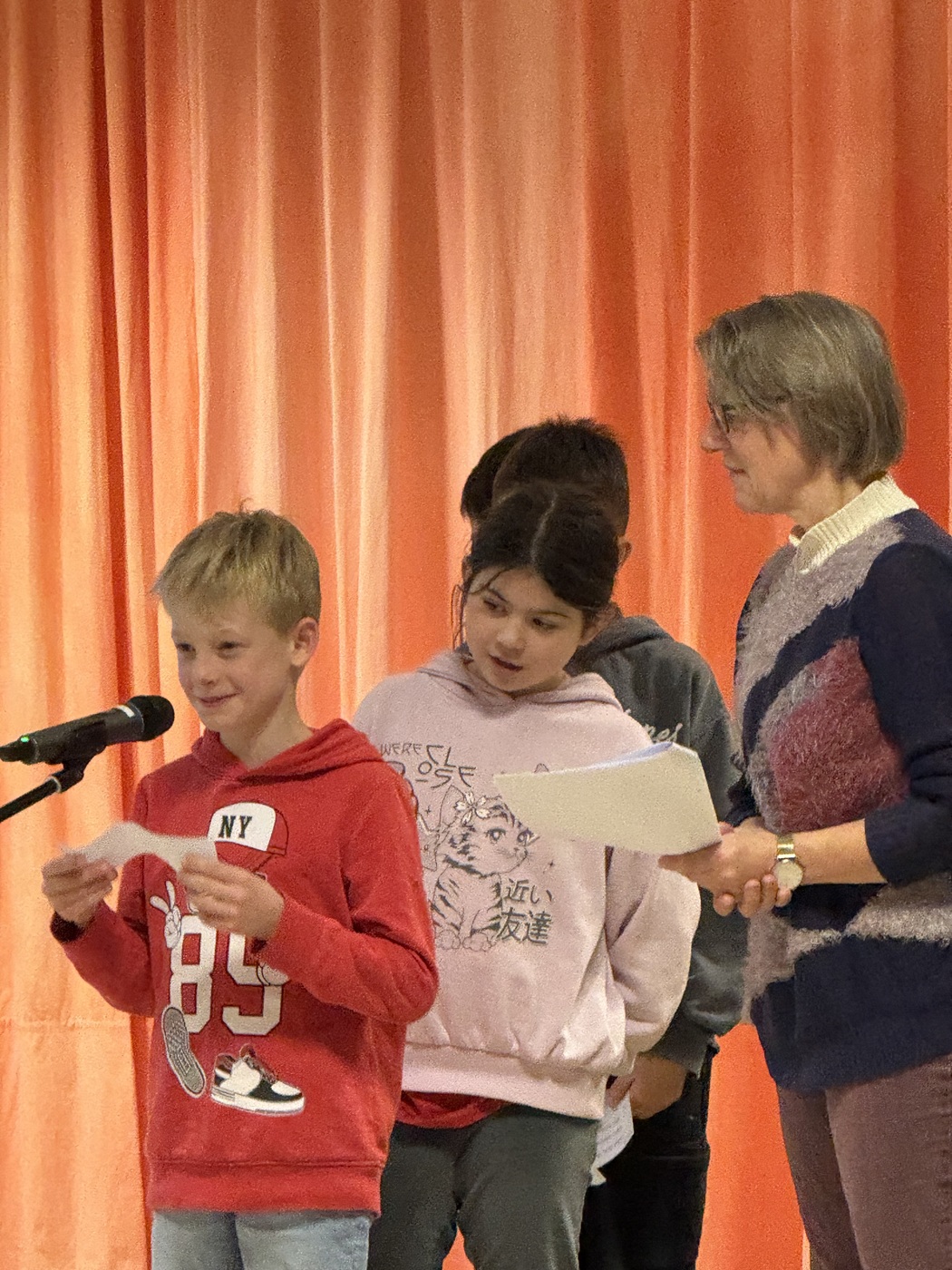 Nach einer kurzen Stille mit anschließendem Gebet lasen uns Zoey aus der SFK-O als Erzählerin und aus der 3. Klasse Leonie, Bastian, Robin, Finn, Elizabeth und Michael in verteilten Rollen die Geschichte „Ben und Clara teilen das Licht“ vom Kindermissionswerk „Die Sternsinger“ von Andreas Gloge (gekürzt für unsere Schule von Elisabeth Pauli) vor. Diese Geschichte war echt spannend. Denn während eines plötzlichen Stromausfalls suchten Ben und Clara mit ihren Laternen den Schlüssel, den ihre Nachbarin Laura verloren hatte. Ihren Nachbarn, Herrn Lehmann, der plötzlich im Türspalt seiner ausgekühlten Wohnung stand, aus der es nach Verbranntem roch, luden sie nach oben zu ihren Großeltern ein, um sich dort etwas aufzuwärmen, mit ihnen Kuchen zu essen und Kerzen zu holen. So halfen sie genau am Martinsabend zwei Nachbarn aus ihrer Not.