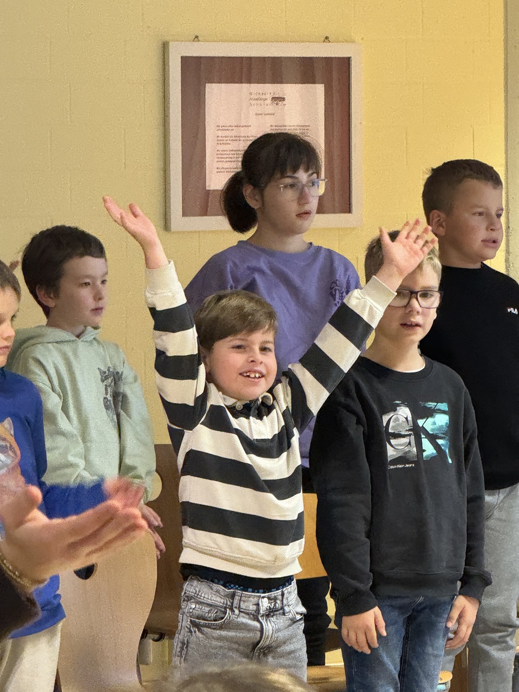 Wie der Heilige Martin dem armen Bettler half, das stellte die Klasse 1A pantomimisch zum Spiellied „Ein armer Mann“ dar.