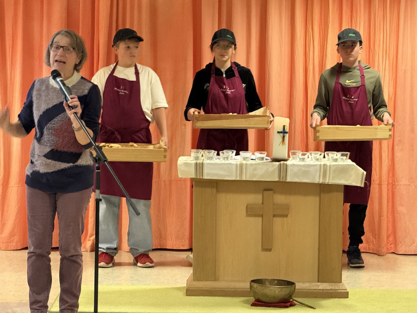 Dass Jesus schon gesagt hat, dass wir Menschen, wenn wir anderen Gutes tun, wie Licht leuchten und er selber von sich als dem Licht der Welt spricht, das erfuhren wir in kurzen erläuternden Worten von Religionslehrerin Elisabeth Pauli. Nach den Fürbitten, die Schüler der 2. Klasse vortrugen, dem gemeinsamen Vaterunser-Gebet mit abschließendem Segen und dem Martinslied „Sankt Martin“ gab es noch eine Überraschung: Wir erfuhren, dass wir mit dem Erlös der „Aktion Martinsgänse“ zwei Kindern in Afrika für ein Jahr lang wieder den Schulbesuch ermöglichen und das neu gegründete Förderzentrum „Santa Catalina“ in Santa Cruz (Bolivien) unterstützen können. Als Dankeschön für die Unterstützung der Aktion Martinsgänse bekamen alle Mitfeiernden noch eine Martinsgans geschenkt, die verschiedene Kochgruppen der Mittel- und Oberstufe unter Anleitung der Fachlehrerinnen Sabine Hartl und Laura Pilsl gebacken hatten. Zum Schluss gab es noch einen riesigen Applaus für alle, die zum Gelingen der schönen Feier beigetragen hatten.