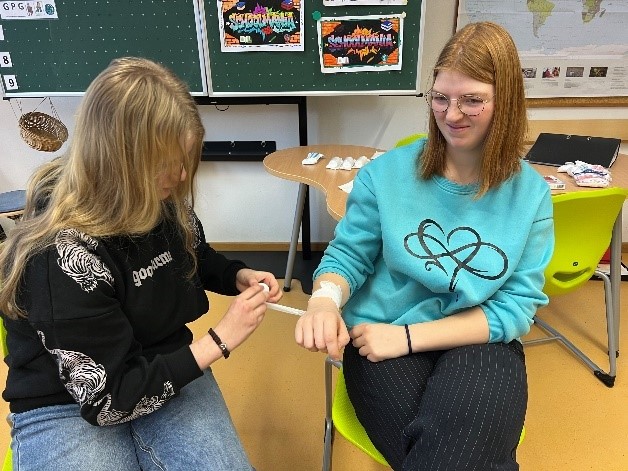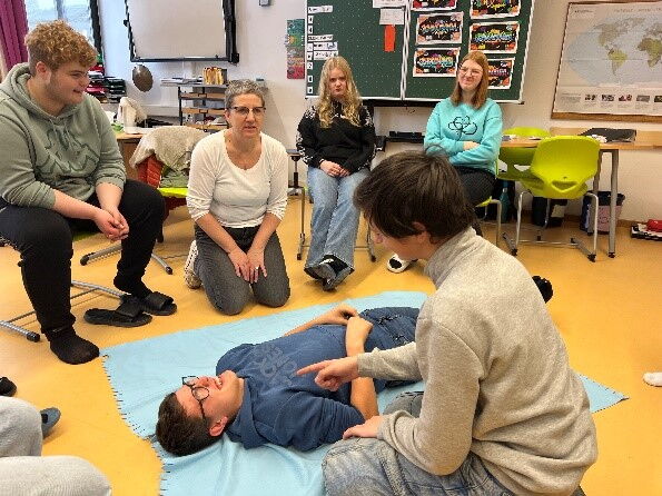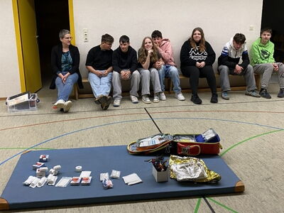 Wenn sich jemand in der Schule verletzt oder plötzlich schlecht fühlt, sind unsere Schulsanitäter zur Stelle. Die 13 Schülerinnen und Schüler der Jahrgangsstufen 7-9 wurden schon im Jahr 2024 von den Maltesern für die Erste Hilfe ausgebildet.